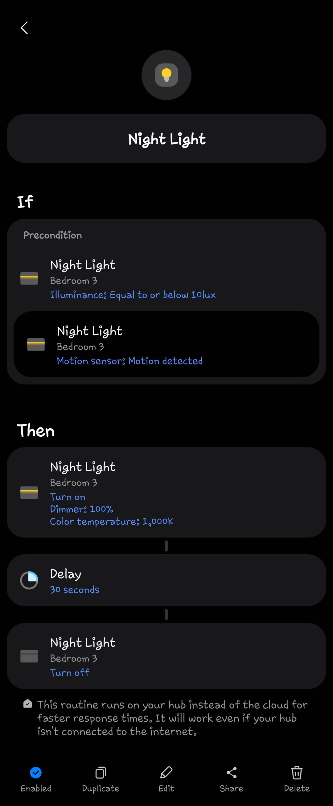 To do this, I connected a ThirdReality Multi-Function Night Light to SmartThings and created an automation. As the name suggests, this device combines a light, a motion sensor, and a light (illuminance) sensor all in one. Thanks to that, I can handle everything with just this one device (plus a hub, of course): when it’s dark enough (in my case, 10 lux or below) and motion is detected, the light turns on, then automatically turns off after 30 seconds. It’s a simple setup, but very useful.