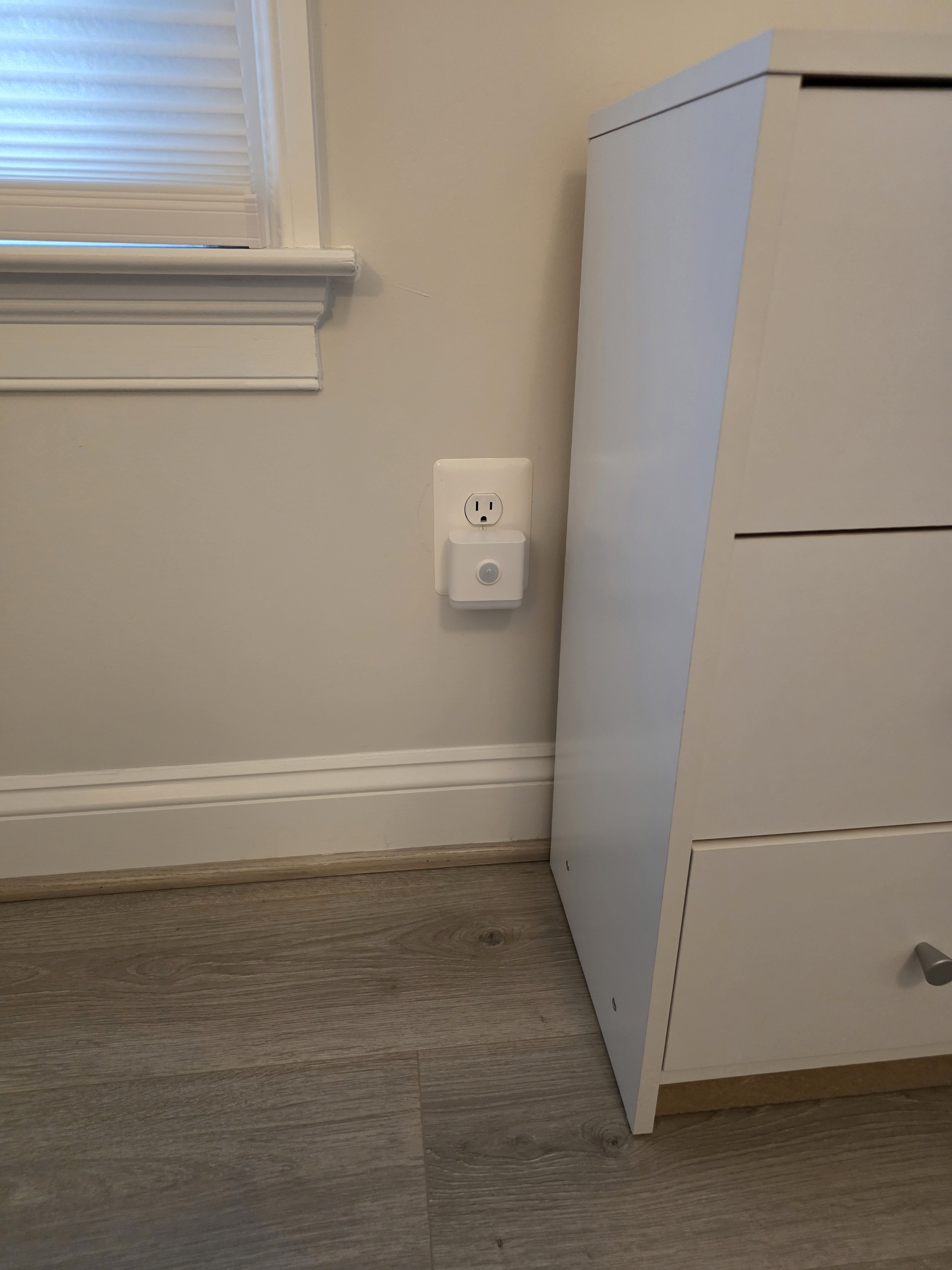 I set up this automation because I kept bumping into the dresser next to my bed when I got up at night to use the bathroom. Now, when I get out of bed and walk past the front of the dresser toward the bathroom, a soft night light shines on the floor so I can see where I’m going and avoid hitting the furniture.