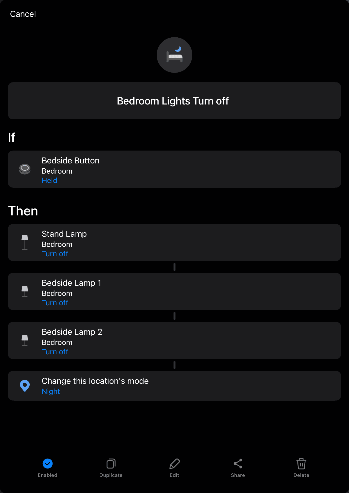I placed a ThirdReality Zigbee button next to the bed and set up an automation so that pressing and holding the button turns all bedroom lights off and changes the Location mode to Night. That way, other automations can use the Night mode as a condition—for example, to adjust lighting, notifications, or other devices differently at night.