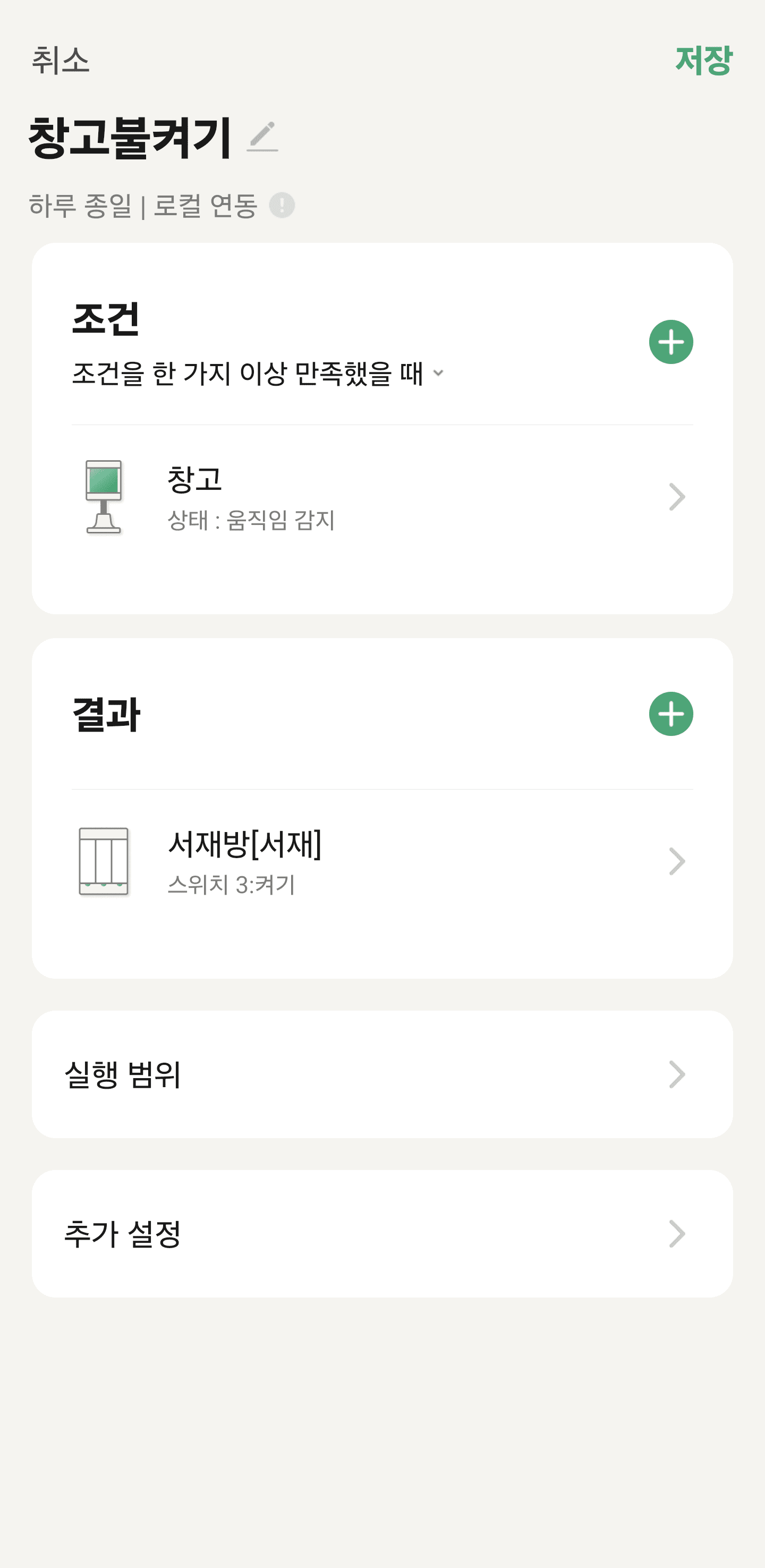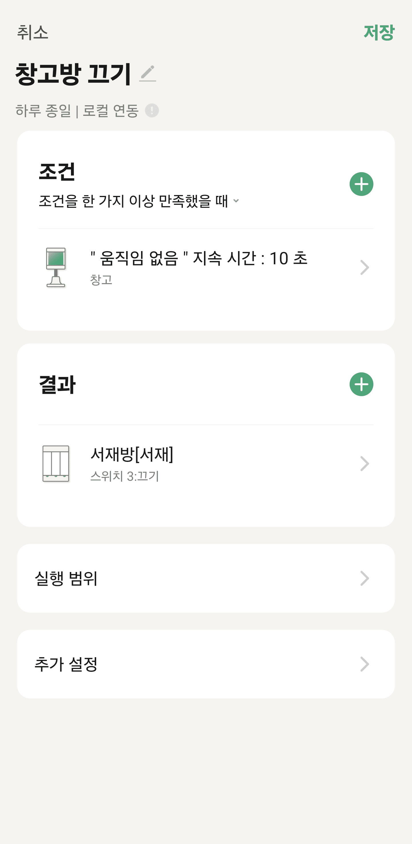 The storage room light is controlled based on whether the door opens or motion is detected.