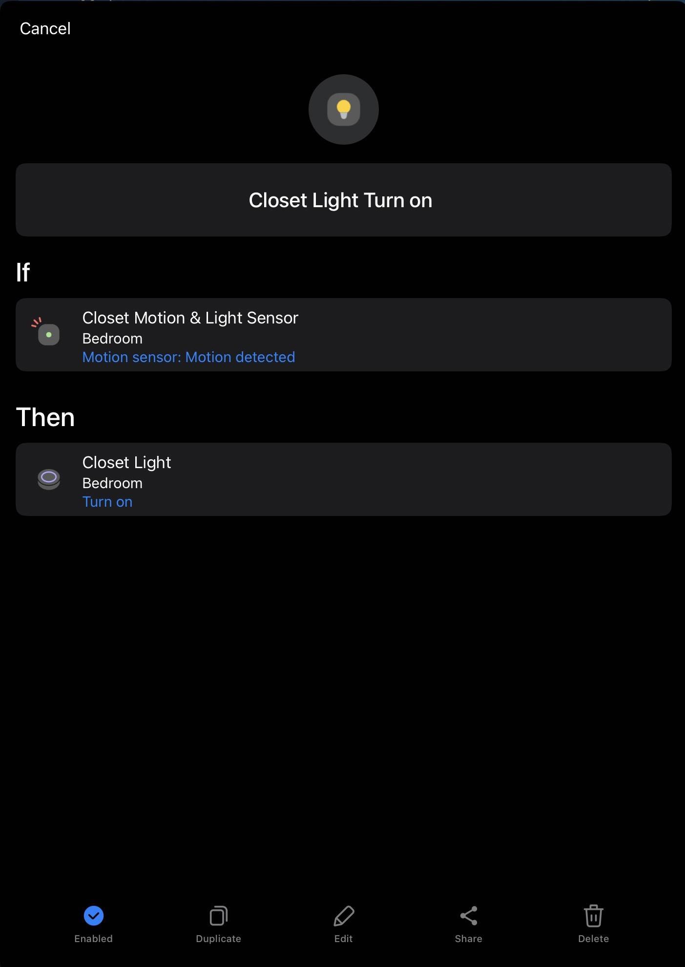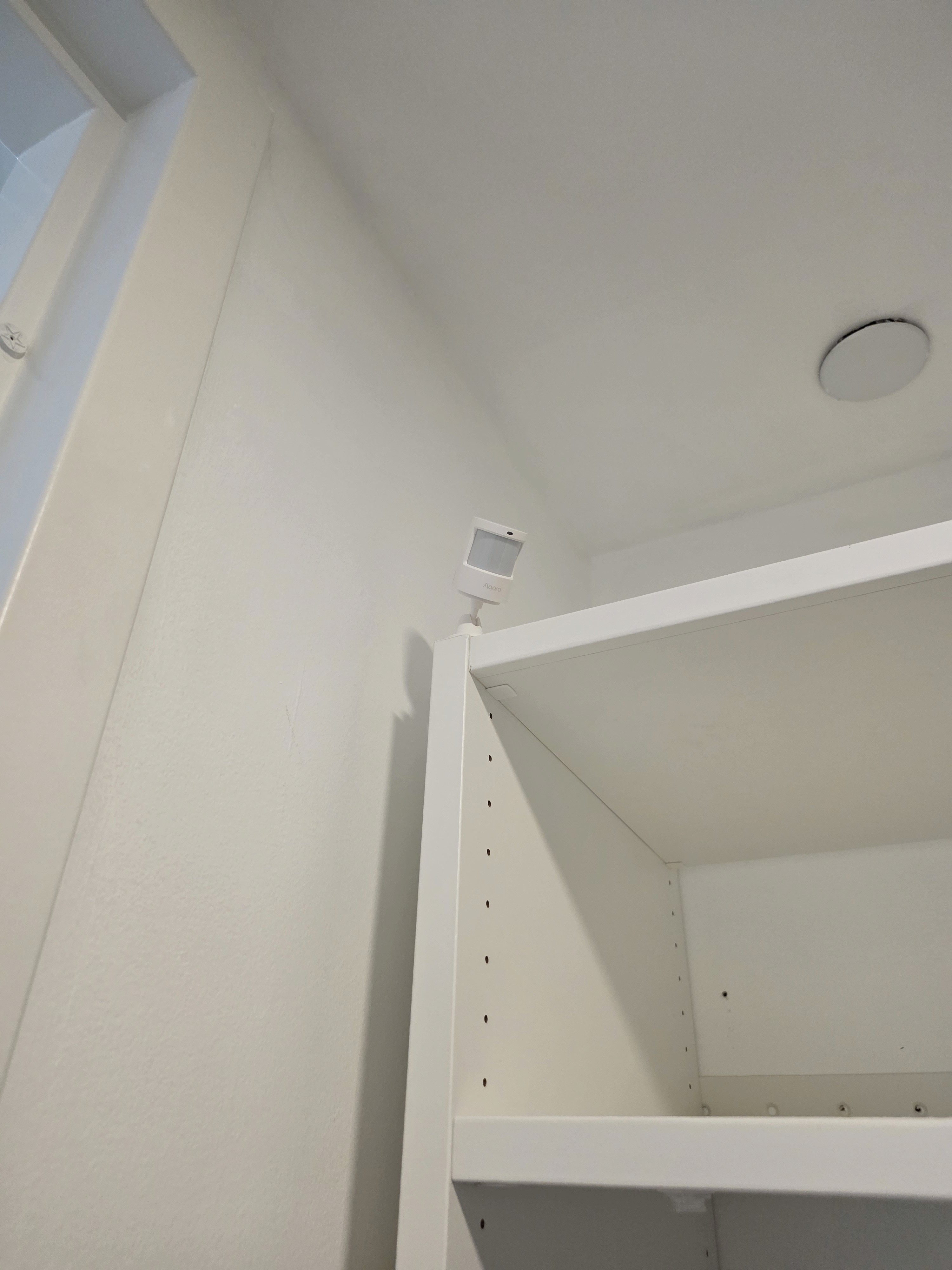 우리집 워크인 옷장의 조명 스위치는 옷장에 가려져 좁은 틈 사이로 손을 넣어 켜고 끄기 불편합니다. 그래서 벽 스위치를 타포 스마트 스위치로 교체하고 옷장 입구 쪽 상단에 모션센서를 설치한 뒤, 동작이 감지되면 스위치가 켜지고, 동작이 감지되지 않으면 스위치가 꺼지도록 설정해두었습니다. 아카라 P2 모션센서는 아무런 동작이 감지되지 않으면 감지되지 않음 상태로 바뀌는데까지 약 30-40초 정도 걸리는데, 이는 옷장에서 사용하기에는 적절한 시간이기 때문에 딜레이를 추가(예. 동작이 감지되지 않음 상태가 1분동안 지속되면)하지는 않고 바로 꺼지도록 설정해서 쓰고 있습니다.