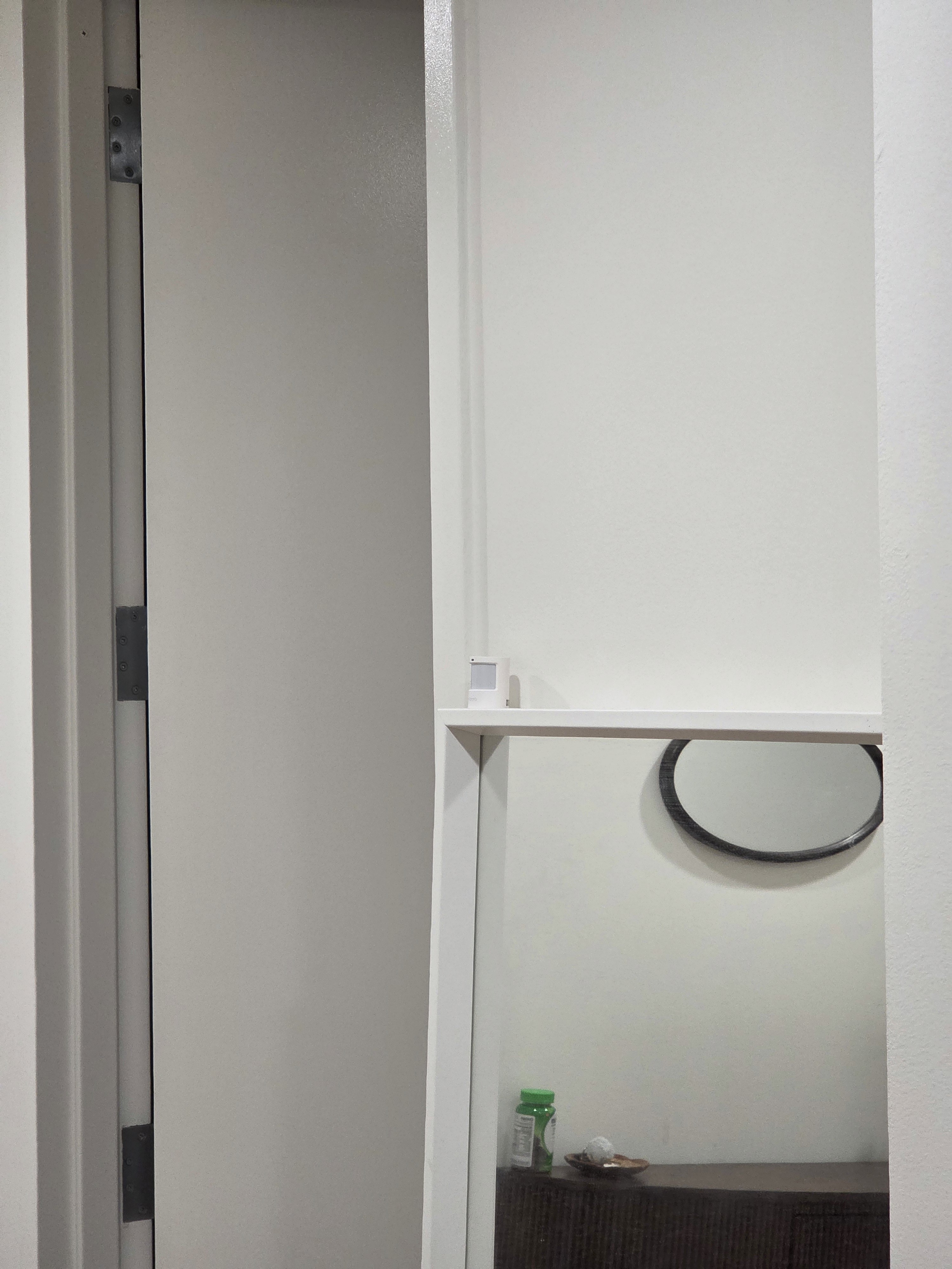 복도에 사람이 있는지를 파악하기 위해 복도 중앙에 있는 거울 위에 아카라 P2 동작감지센서를 배치하고 복도 쪽 움직임만 감지하도록 각도를 잘 조정해두었습니다. 아카라 P2 동작감지센서는 조도 측정도 가능하기 때문에 해당 공간이 충분히 어두울 때만 조명이 켜지도록 하는 자동화도 설정이 가능하지만 우리집 복도는 한낮에도 대부분 어둡기 때문에 조도와 무관하게 동작이 감지되면 켜지도록 설정했습니다.