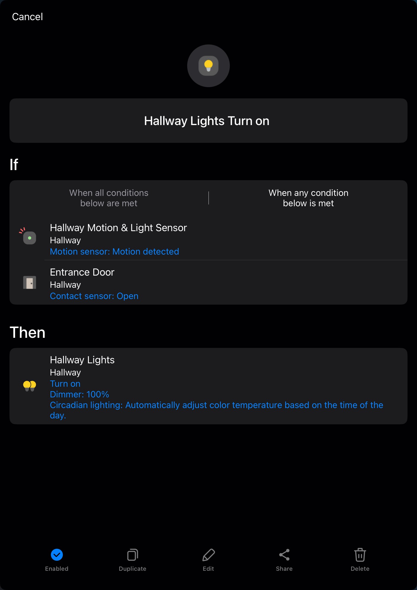 물론 현관문이 열리면 문의 움직임이 동작감지센서에 감지되긴 하지만 도어센서가 더 빠르게 감지해 조명을 켜주기도 하고, 현관문의 열림/닫힘 상태는 다른 자동화들에도 활용하고 있기 때문에 이와 같이 자동화를 만들었습니다. 물론 복도조명을 끄는 자동화에는 현관문 열림과 상관 없이 동작감지센서에 동작이 감지되지 않으면 조명을 끄도록 설정해서 사용하면 됩니다.
