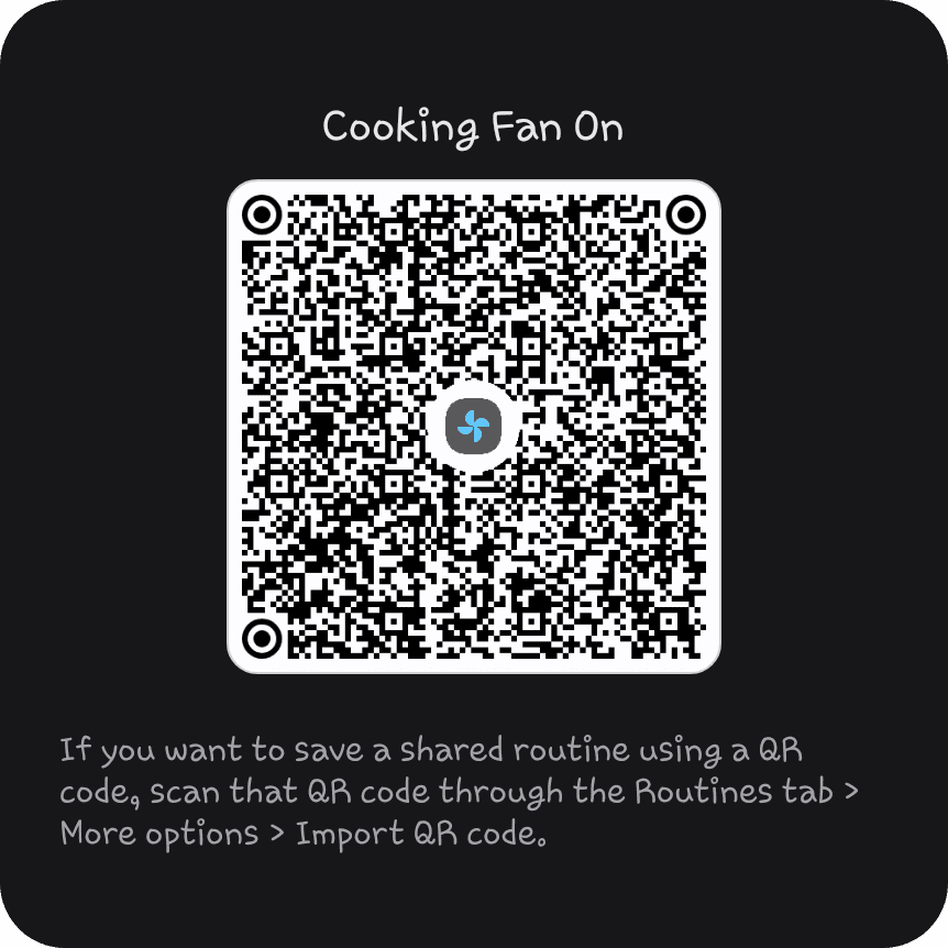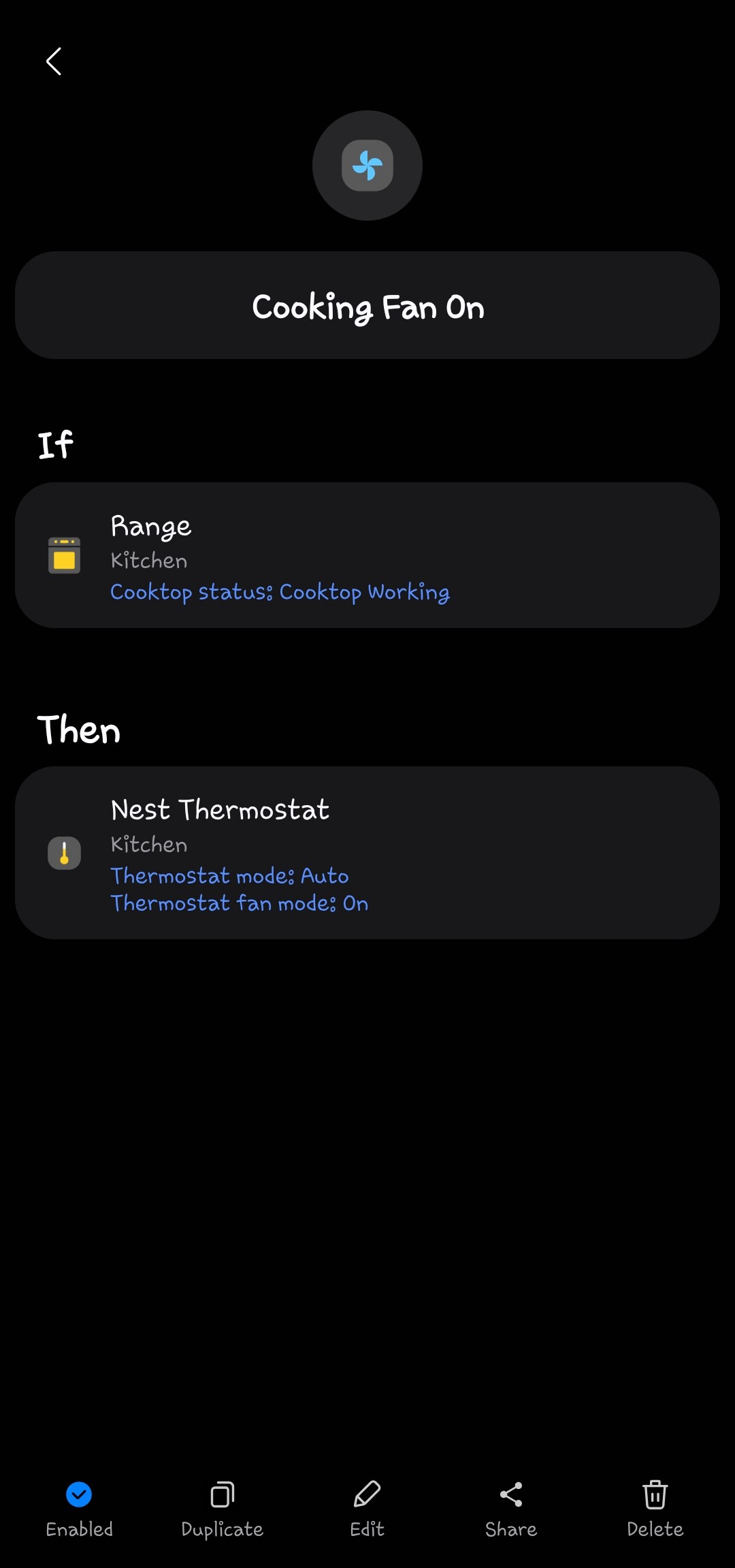 주방에 창문이 없어서 요리를 할 때 매번 온도조절기에서 환기 모드를 수동으로 켰었는데 이것을 쿡탑이 켜지면 자동으로 환기 모드가 켜지도록 자동화했습니다. 내가 사용하는 가스레인지는 스마트싱스에 연결해 쿡탑의 작동 상태를 알 수 있고 이를 자동화의 조건으로 사용할 수 있습니다. 그리고 네스트 온도조절기 3세대를 네스트 앱에 먼저 등록한뒤 계정 연결을 통해 스마트싱스로 가져오면 환기 모드를 켜거나 자동 상태로 설정할 수 있습니다. 이것들을 조합해 쿡탑이 작동 중이면 온도조절기의 환기 모드를 자동이 아닌 켬 상태로 전환해서 음식 냄새의 배출을 돕도록 만들었습니다.